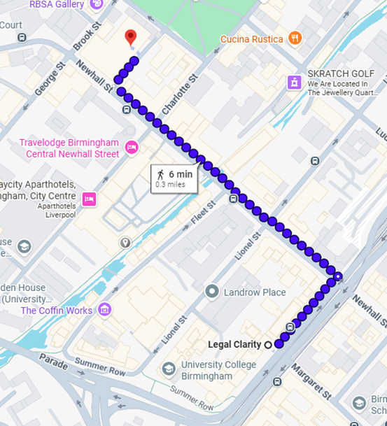 Legal Clarity do not have car parking facilities. The closest car park to our offices is NCP Birmingham Newhall Street, Newhall St, Birmingham, B3 1SW. Alternatively, there is street parking available for up to four hours on Newhall Street. The NCP Newhall Street car park is approximately a 6-minute walk from our offices. See map below.